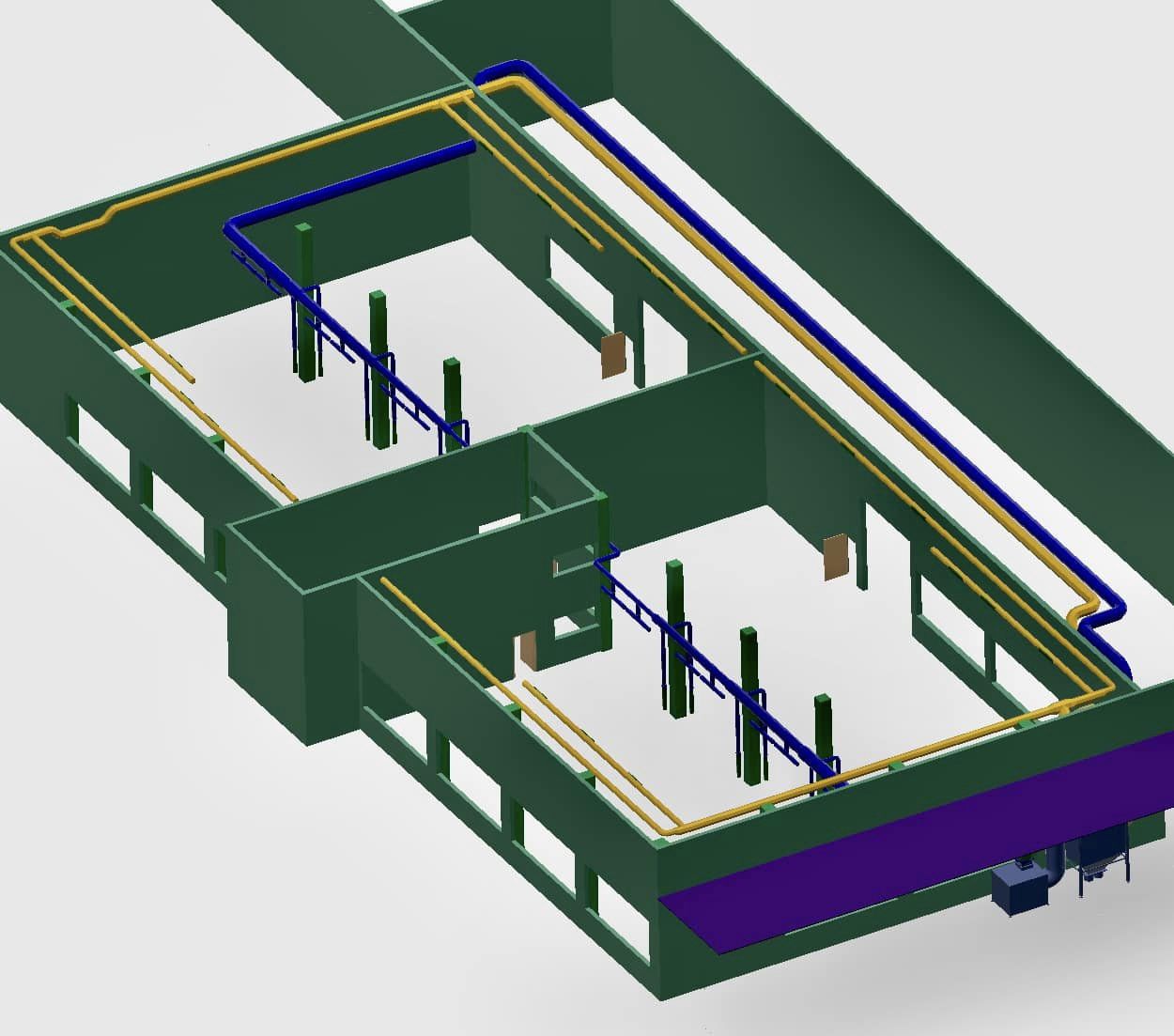 Anforderung: – Zusätzliche Hallenlüftung für Hallenschiffe als Ergänzung zu vorhandenen Absaugungen – Schweißrauch von Stahl und Edelstahl – Zwei Hallen unterschiedlich regelbar – Heiz- und Lüftungskonzept